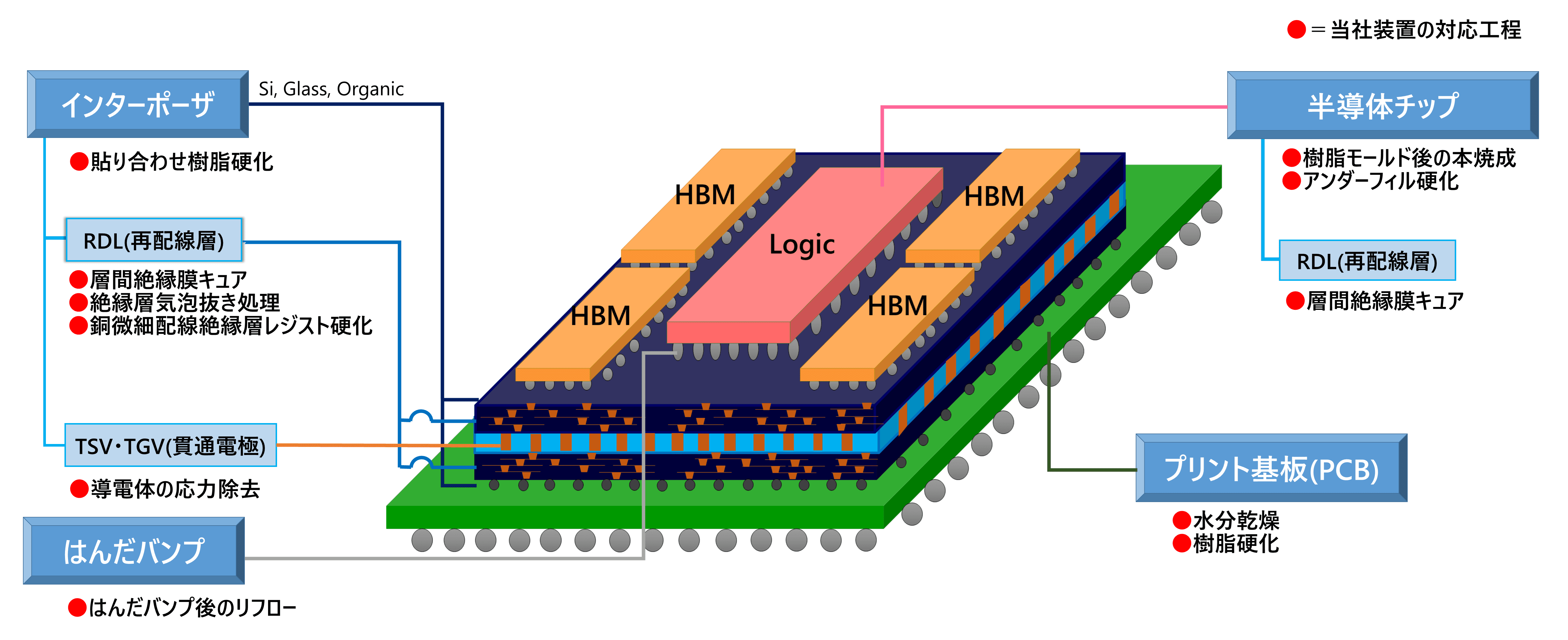 プリント基板(PCB)の乾燥や、Siインターポーザ・RDL(再配線層)・ガラスインターポーザなどの各種熱処理の他、はんだバンプ形成後のリフロー、 チップモールド後の焼成などに対応しています。また、FO-WLP(Fan Out-Wafer Level Package)・WL-CSP(Wafer Level-Chip Size Package)用熱処理装置にも豊富な納入実績がございます。